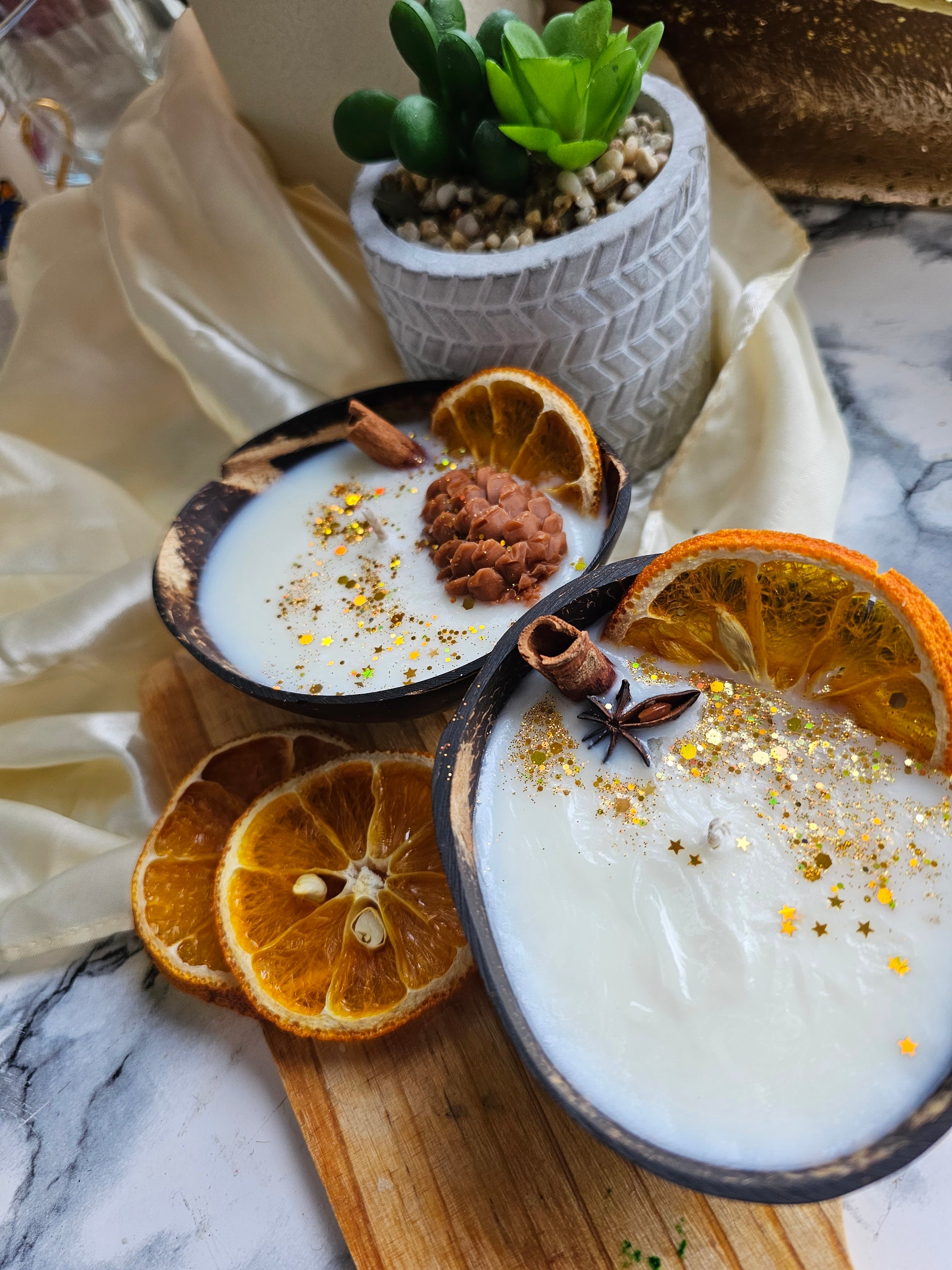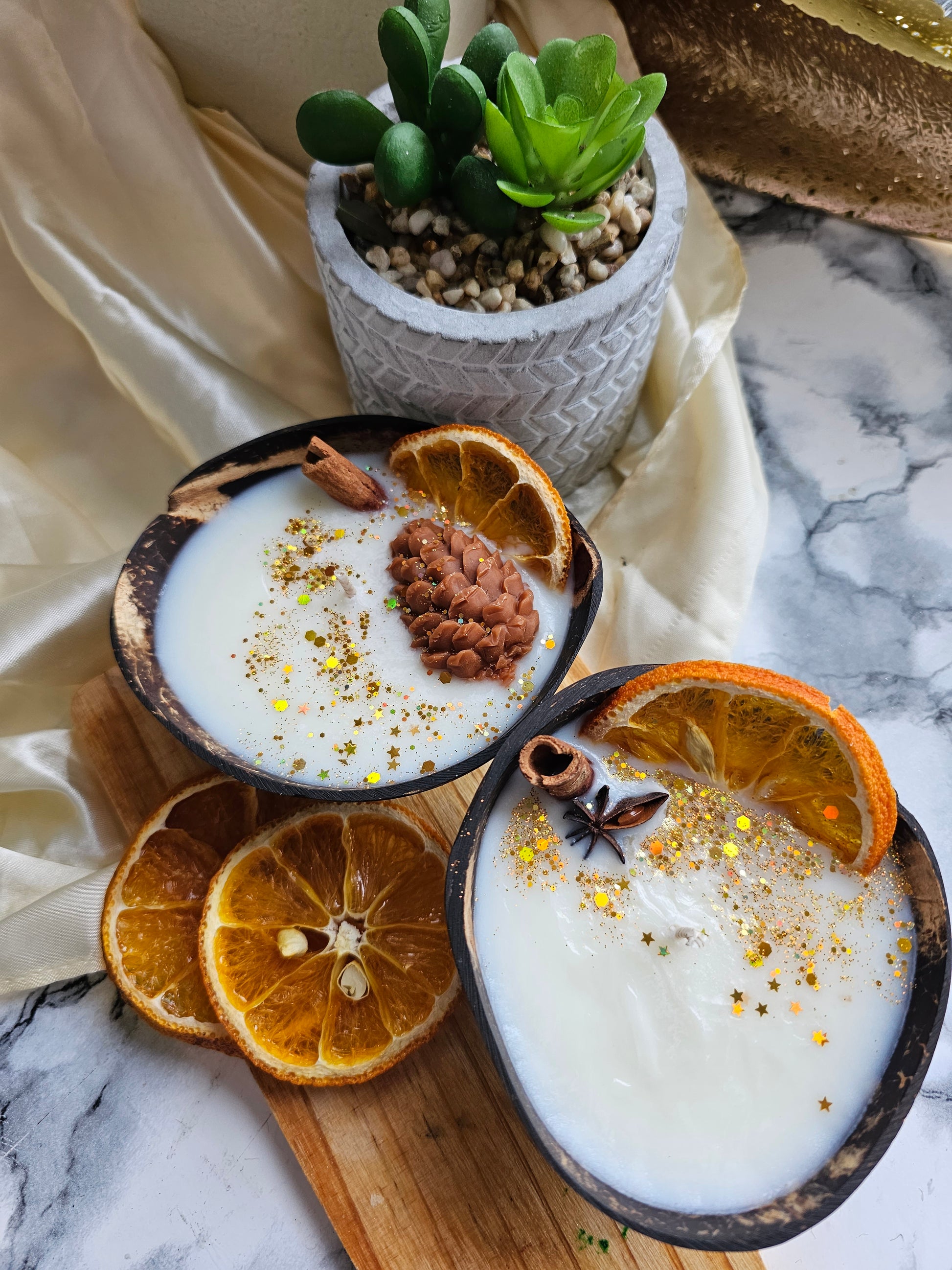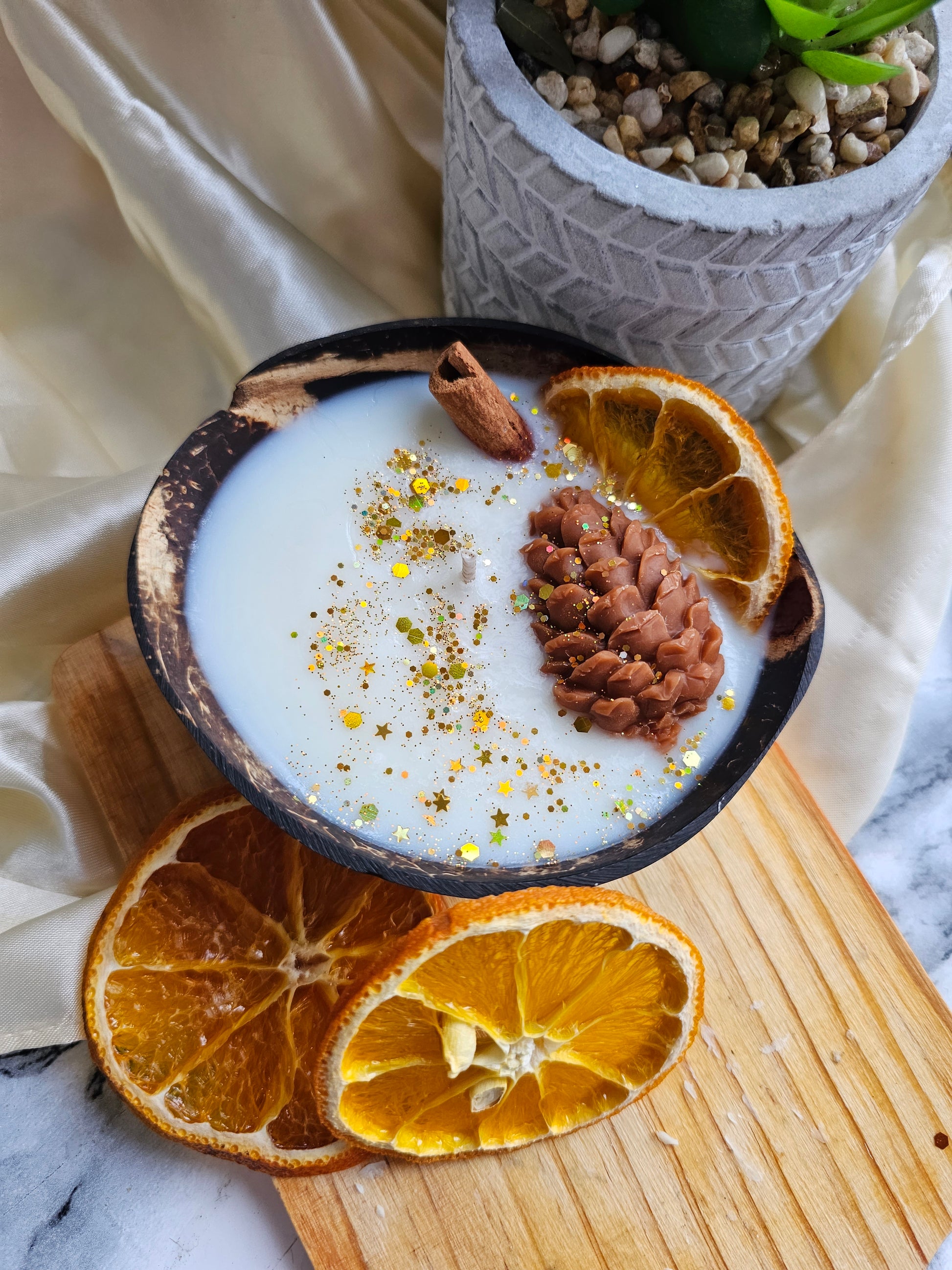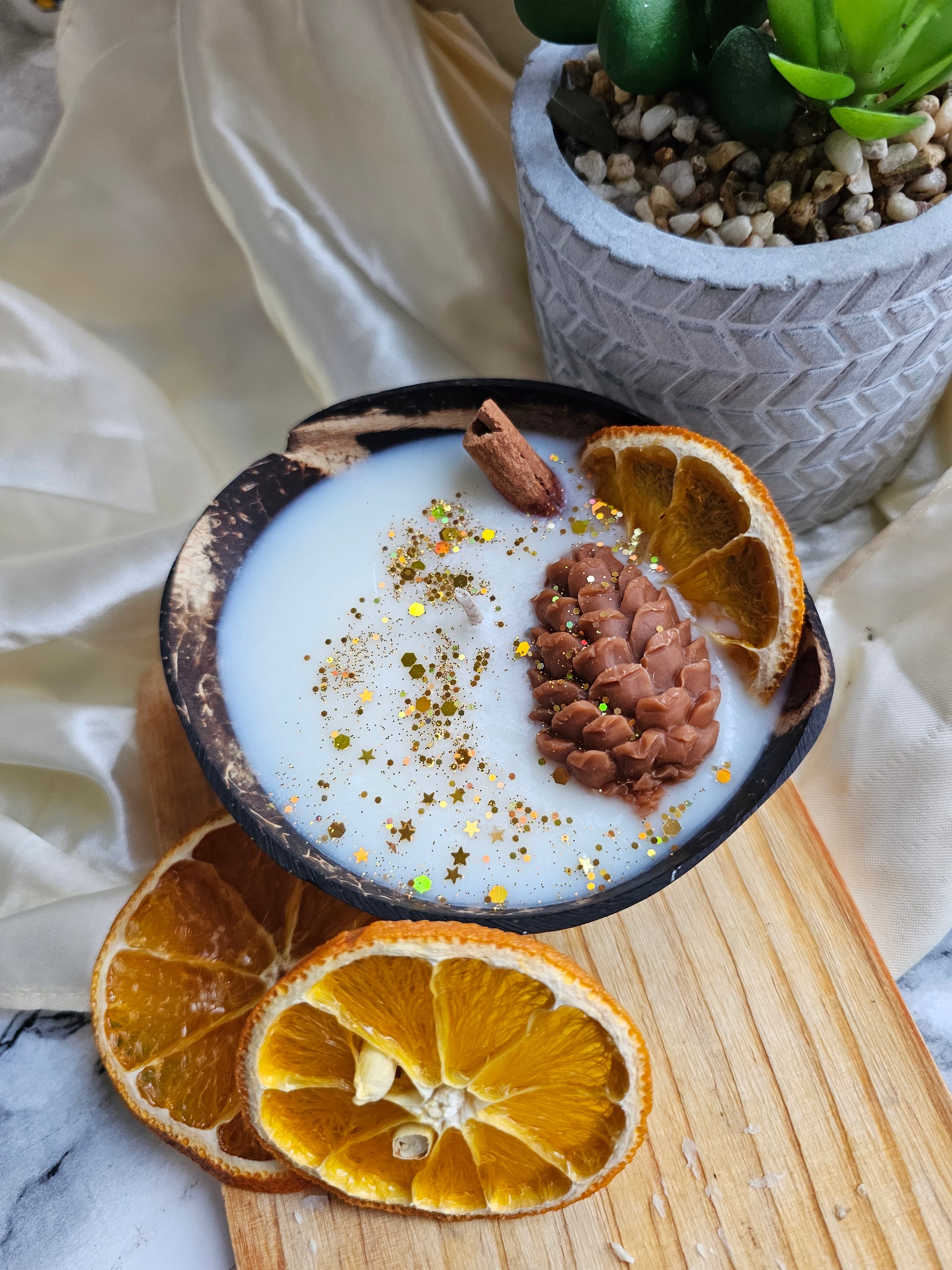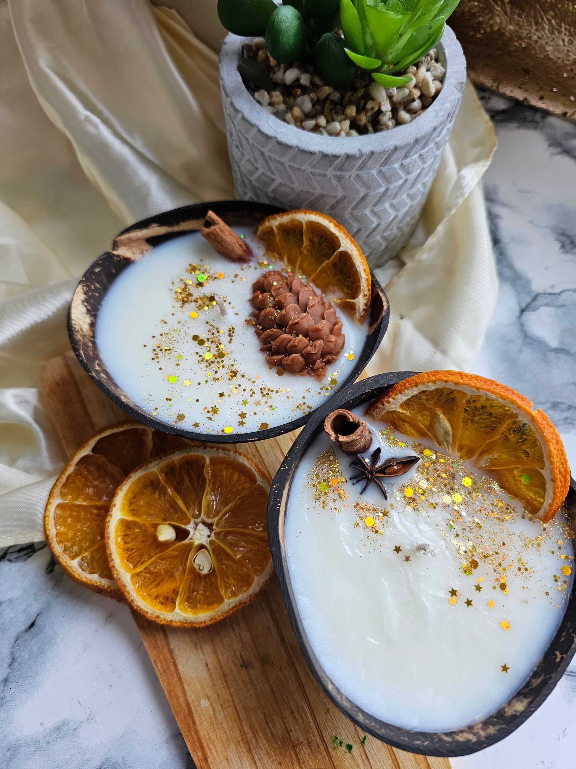 This is a beautifully hand-poured eco soy wax candle presented in a coconut shell. The creamy white wax is topped with decorative accents that reflect its warm, spicy scent profile — a cinnamon stick, a pinecone-shaped embellishment or star anise, dried orange slices, and a sprinkle of gold glitter with star confetti. Its fragrance blend of cinnamon, patchouli, and oud promises a rich, grounding, and cozy aroma — perfect for creating a warm, luxurious atmosphere.