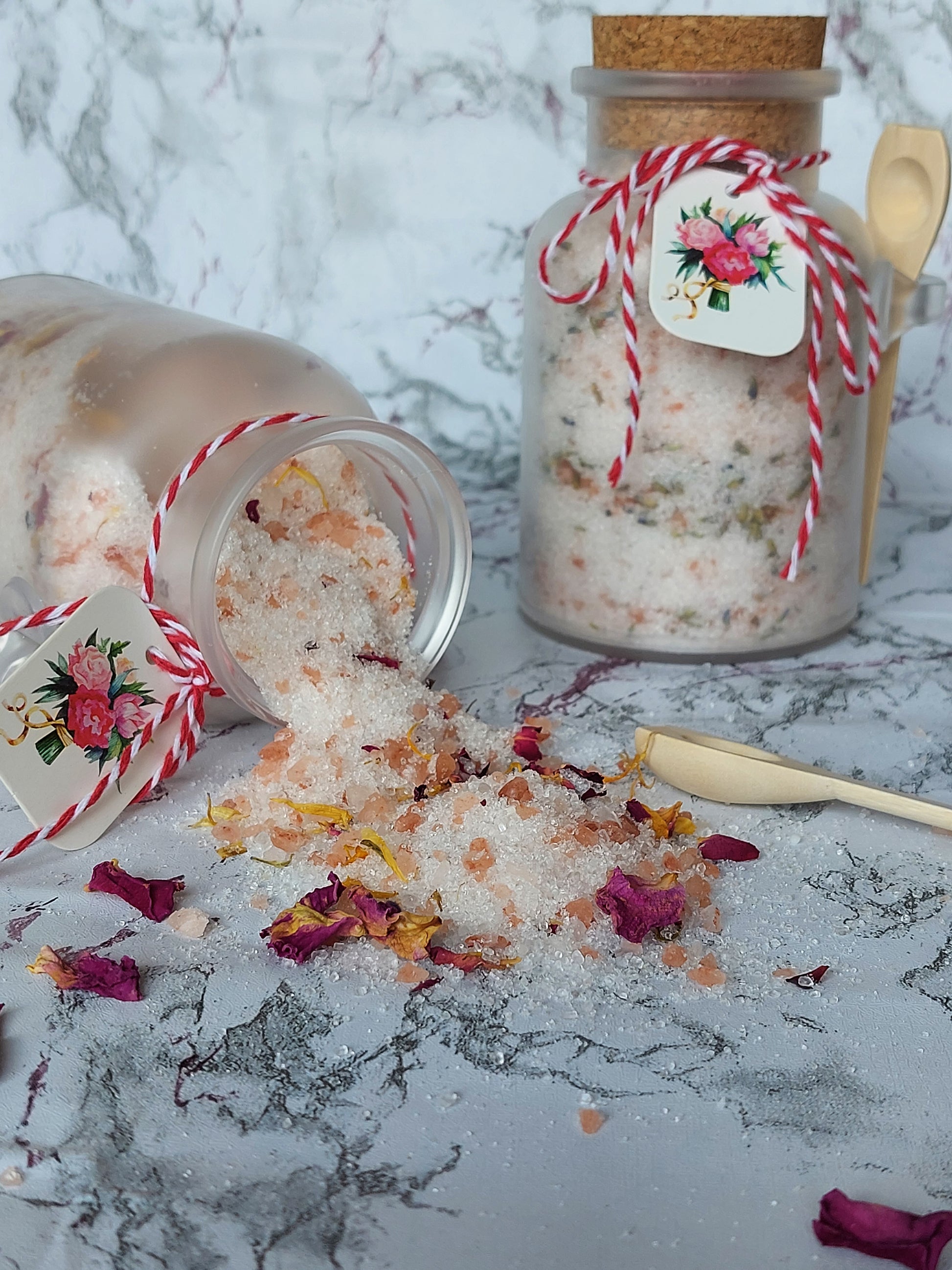 For thousands of years the healing and therapeutic qualities of salt baths have been highly acclaimed and have traditionally been used to ease aches and pains and numerous skin ailments. Our Soap & More bath salts contain Epsom salt, Himalayan salt, kaolin clay, rose oil, rose petals and dye colouring.