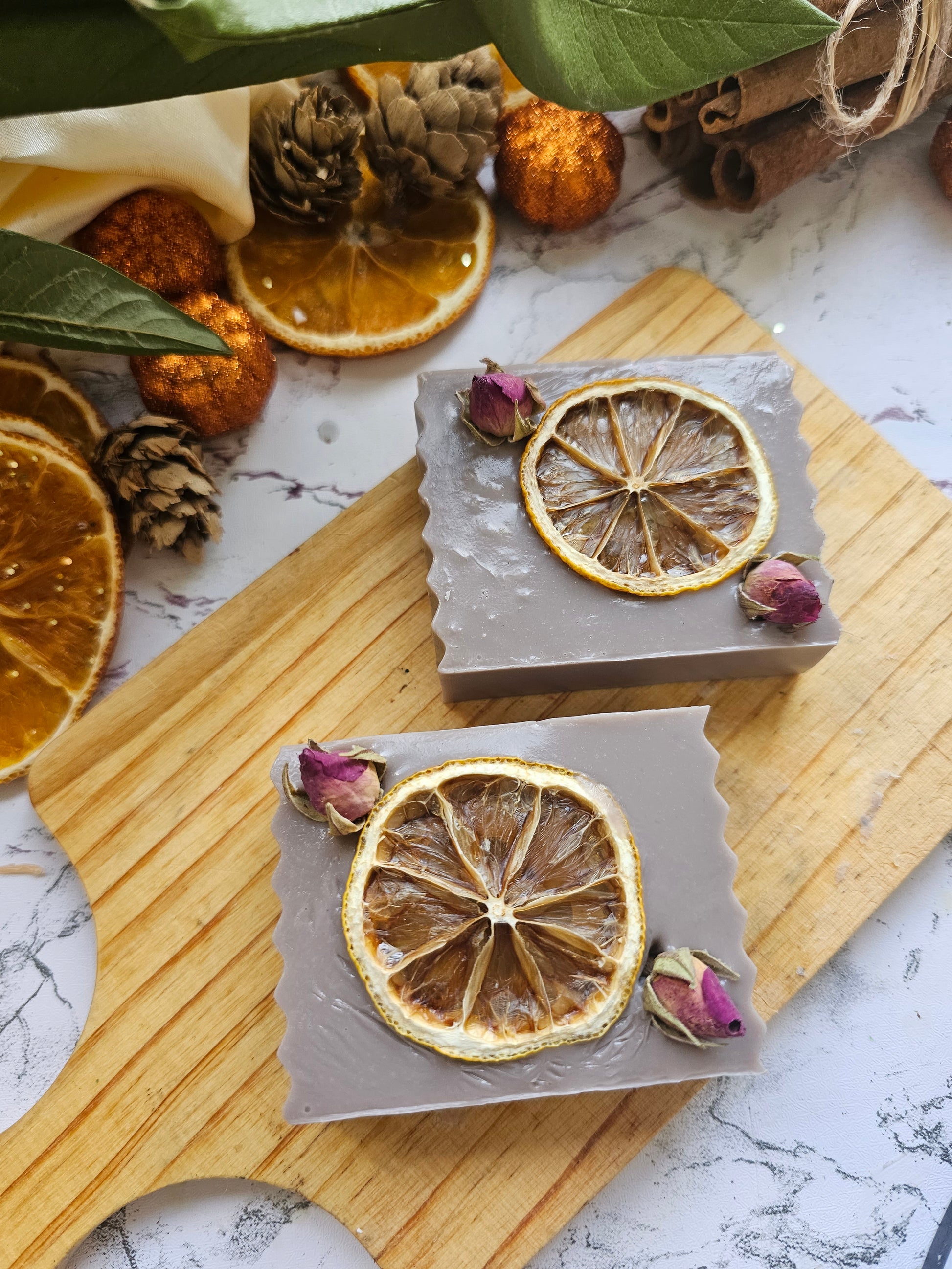 Dried Orange Slice: Infuses the soap with a refreshing citrus aroma while adding a natural exfoliating touch. Oranges are rich in vitamin C and antioxidants, which help brighten and revitalize the skin.